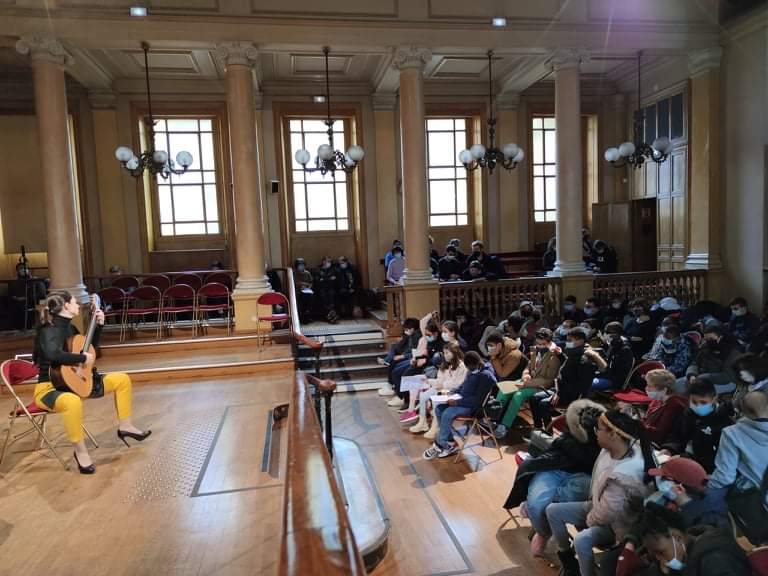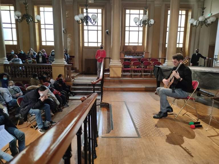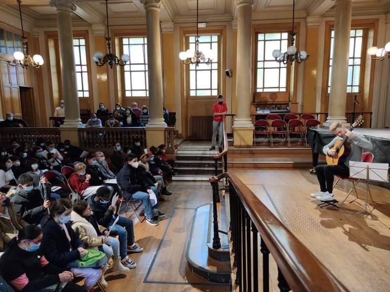 Just like it was the case the year before, Paris International Guitar Festival once again welcomed our EuroStrings Artists and organized some audience development activities. This included a concert for young blind people at the Young Blind National Institute in Paris. Jack Hancher, Marcell Nickmann, Ozberk Mirac Sarigul and Bianka Szalaty each played for young pupils on November 25th, 2021. Most of the pupils are also guitar pupils. The performance was followed by a little chat between the EuroStringsArtists and the audience.