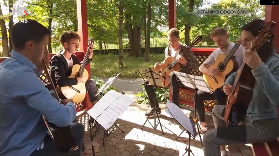 After that, EuroStrings Artists Jack Hancher, Ozberk Mirac Sarigul, Bianka Szalaty and Filip Mišković, alongside Lovro played a short piece “Iberia”, written by Croatian female composer Bianca Ben. They tuned in live to the show from the Botanical garden.